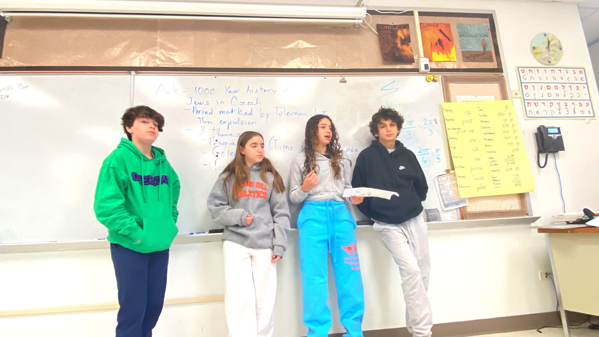 I think I speak for the whole 8th grade when I say that this Torah was a bigger gift than any of us could ever imagine receiving. As you heard from Josie, Jackson, Fabi, and Maya we got to design a safe place for this Torah to stay when not in use. 7th graders, 6th graders, and even fifth graders, you will have this Torah as your responsibility very soon. We ask you to understand how meaningful it is to have this specific Torah in your hands. This is not like a responsibility of doing homework or writing a paper, this is the responsibility of holding onto the life and culture before the Holocaust. This Torah is a real historical artifact that is in 8th graders’ hands. Don’t be scared to take on this much responsibility, be excited to get the opportunity to have this much responsibility for something that we all care so much about; Judaism, our culture. Our only request is that you who follow, care and respect it in the same way we have this year. Now, we would like to ceremonially pass the Torah from the eighth grade to the seventh graders.