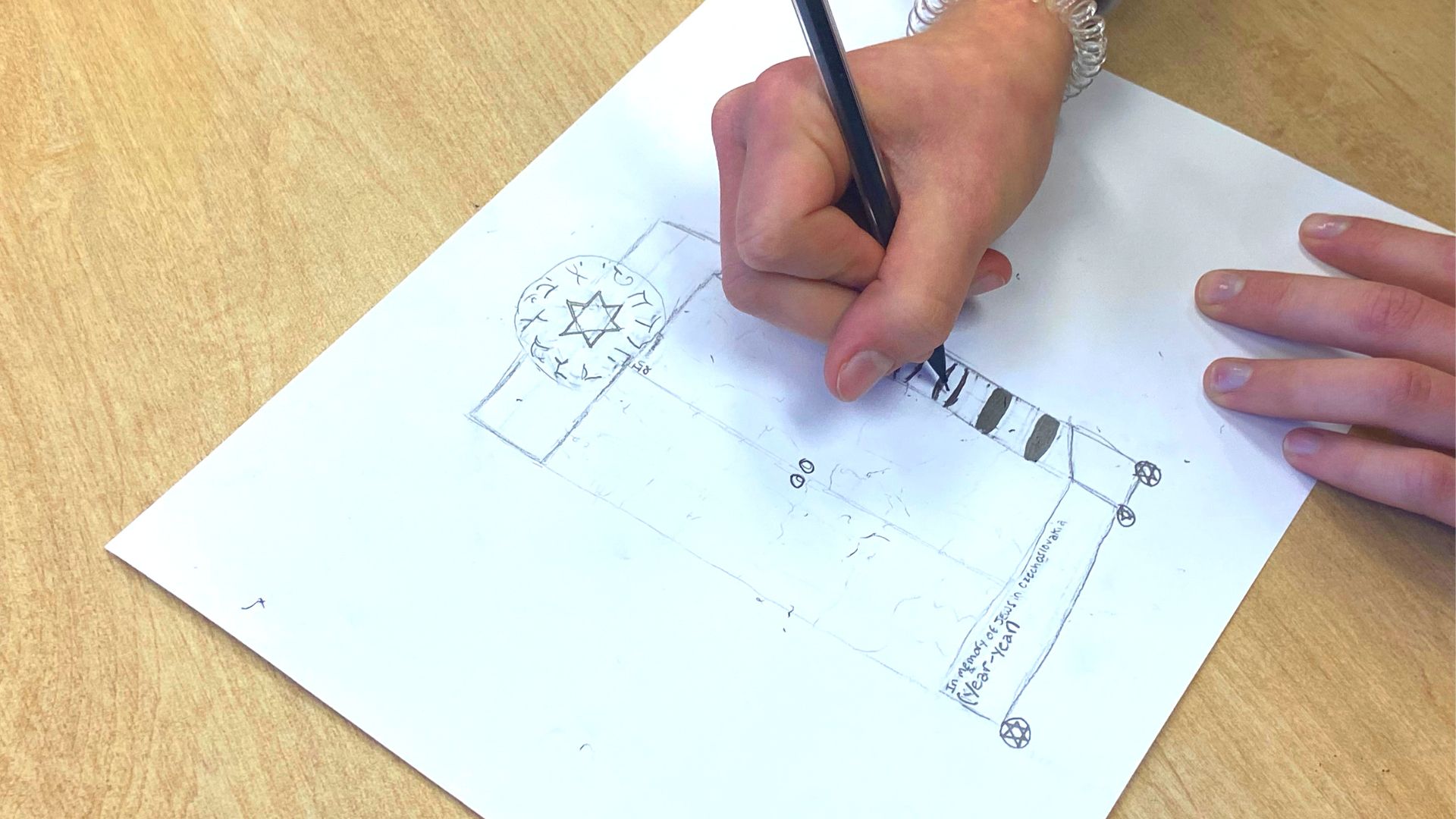 sing an interdisciplinary model that combined art and history classes, the eighth-grade class of 2023 designed an ark, a curtain, a mantle and even a binder sash for our Torah. In groups and individually, students researched the history of Jews in Czechoslovakia, before, during, and after the Shoah and then created these designs. The designs were inspired by photos and information that was kindly provided by historians who work at the reconstructed synagogue in Ruchnov. Without their help this project would have been near impossible. The design of the ark, the curtain, and the mantle and binder, represent a journey through centuries of Jewish life in Czechoslovakia: 1.) The ark represents the thousand-year life of Jews in Czechoslovakia before the Holocaust and 2.) The curtain represents the Shoah and finally 3.) The Torah mantle represents Jewish ‘life’ in Rychnov today and tomorrow.