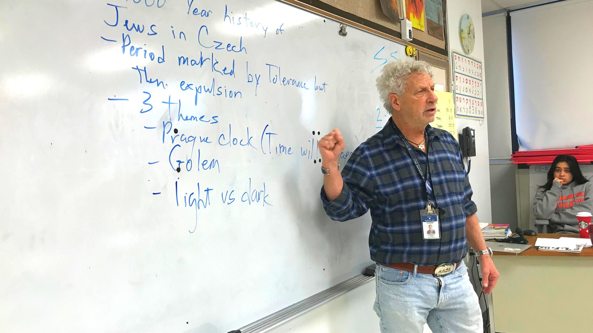 The ark curtain shocks us with the horror of the Shoah itself. The Golem is bowed over and distraught. Flames send sparks into a black night sky. The expired Prague Clock has stopped ticking at “yud-bet,” midnight. The Dali-esque clock melts into the flames. The Hebrew letter “hey” (representing God) is falling off the face of the clock and the Magen David has fallen off the synagogue roof, as the once vibrant village is turned to rubble.